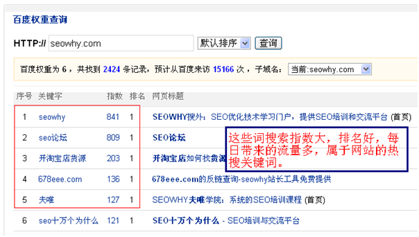 我们可以从站长工具(http://mytool.chinaz.com/baidusort.aspx)上查询,网站有多少流量来自搜索引擎,最高的那些就是热搜关键词。