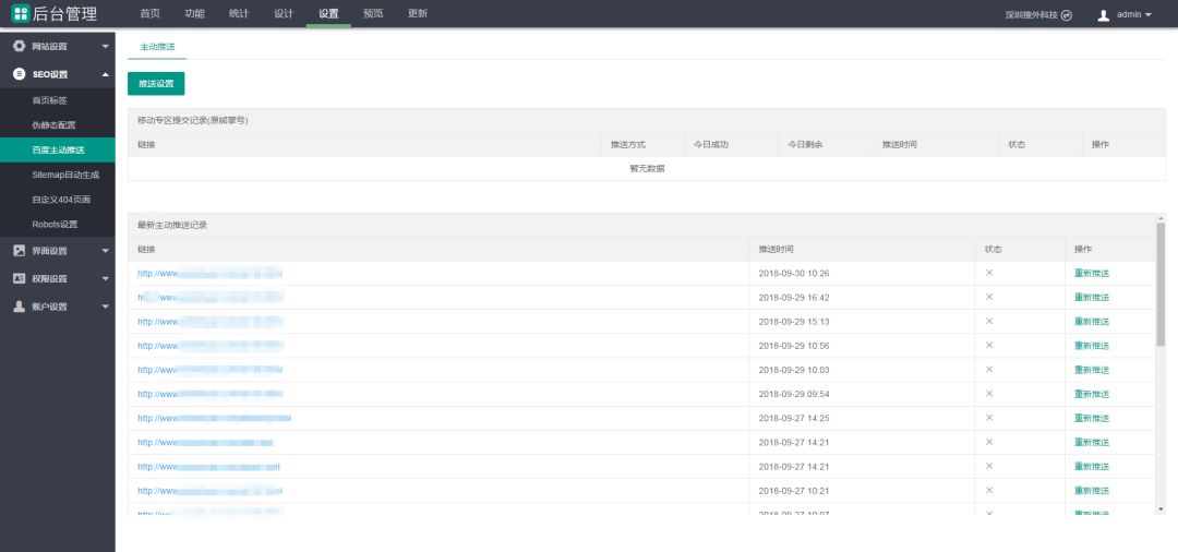 ·设置完成以后每天发布文章后文章可以网站自己进行主动推送,站长只需要偶尔看下推送成功与否,如果推送失败点击重新推送即可。