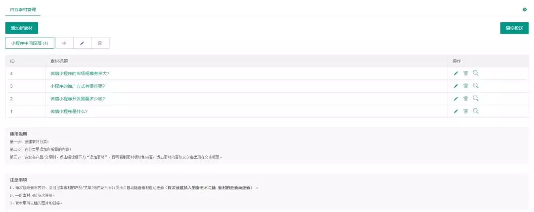 有了内容渠道,内容制作的更高级操作是,SEO技术和编辑们一起先建立内容素材库,把新媒体等位置获得的内容进行重新拆分和封装到素材库里,每一个话题都有多个素材可使用。一个网站准备了全部素材后,需要推送给其他网站。搜外6系统就特别为这个需求开发了一个叫“隔空投送”的功能,可以一键在多个站之间互相投送素材。