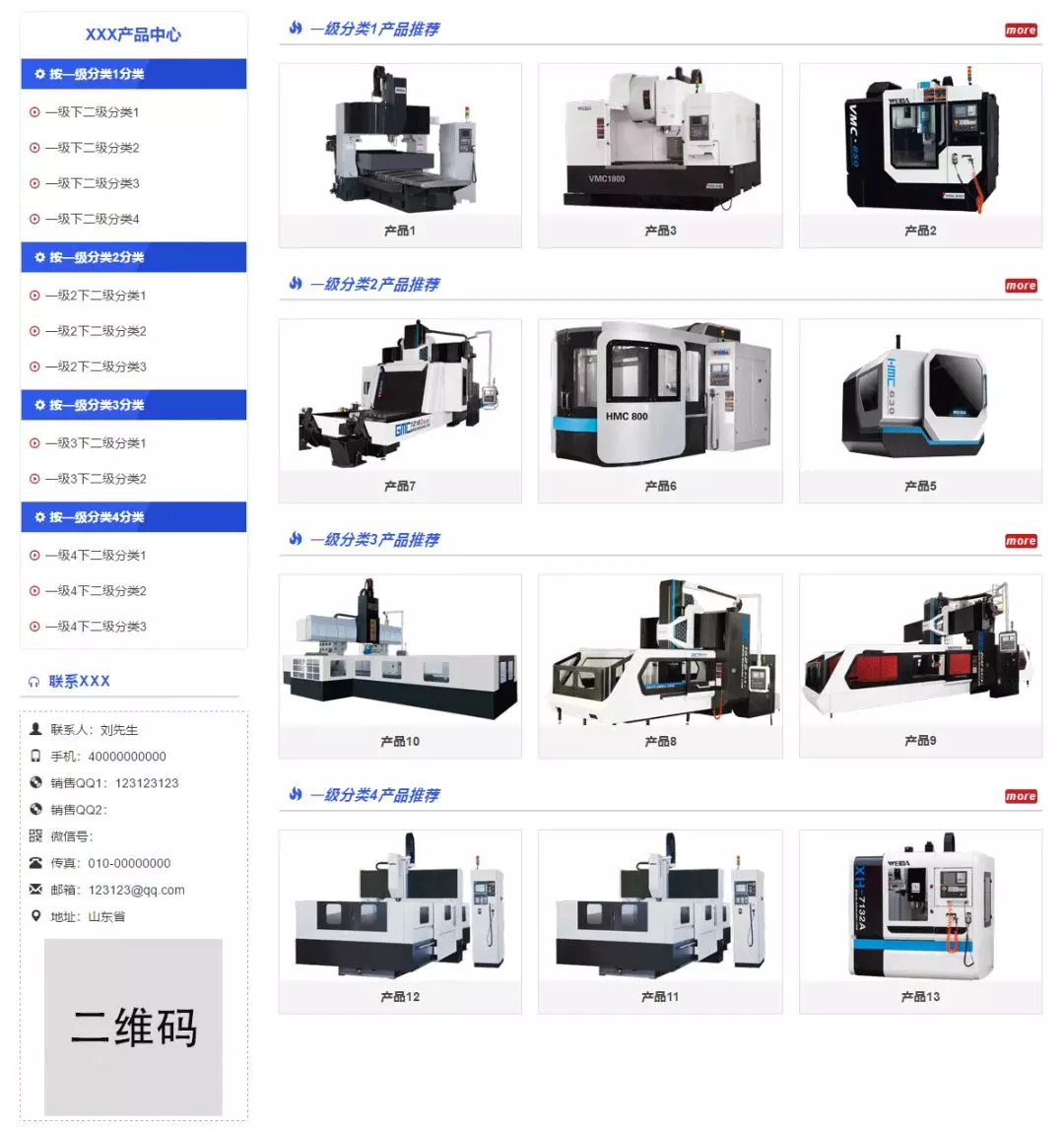 如上九大模块的首页设计是属于F型的结构,考虑到营销型网站采用响应式,为避免栏目页面手机端首屏被分类占满,所以栏目页面的设计一般是采用反F型结构,即页面左侧展示产品列表,右侧展示产品分类目录。